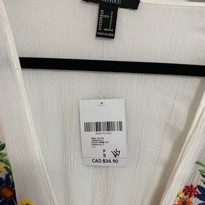 Floral coverup with an elastic waist (ties in the front) Pretty see-through but great over a bathing suit. Flowy and has bell sleeves. Never worn.
