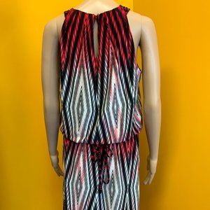 Sleeveless Black, Grey, Red & White Dress.  Diamond Pattern.  Tie Waist.  Back Neck Button Closure Size 10