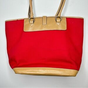 Beautiful red canvas tote with smoother leather details on the edges, straps and the buckle detail. Reminiscent of the classic Dooney & Bourke vintage canvas cabrio bucket bag.