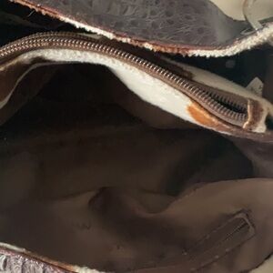 This shoulder bag showcases a striking cow print in brown and cream, complemented by brown leather trim. The Western-inspired silver-toned hardware, featuring a sparkling buckle closure, adds a touch of glam to its design. Perfect for those who appreciate a blend of rustic charm and modern elegance.