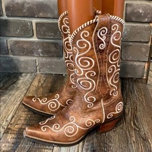 Soft brown Ariat leather cowboy boot with cream swirl stitch and lacing detail! Snip toe! 12” shaft! Rubber soles! 2” heel! Size 6.5! Like new! Worn a handful of times! From clean NS home!