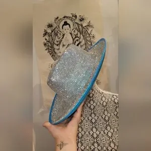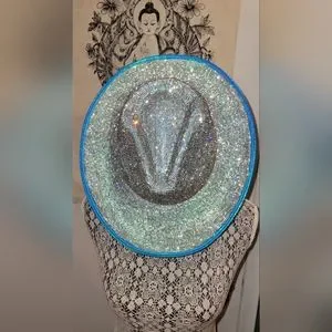 bedazzled cowboy hat! this one is ready to ship and has a blue base hat color. The video is what the rhinestones look like in the sun, unfortunately haven't been able to get a video of the blue in the sun because of weather.