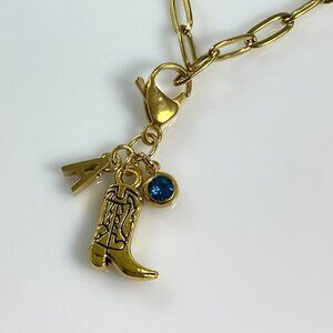 Material: Birthstone: Gold plated stainless steel and zirconia stone; Letter: Stainless steel; Cowgirl boot: gold plated brass