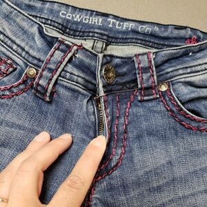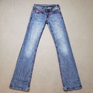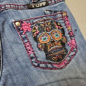 Cowgirl Tuff lowrise flare embroidered sugar skull jeans pink thick stitch sz 24