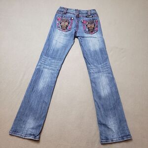 Embroided skull pockets! These are so gorgeous with thick pink stitching and embroided embellished back pockets. These are a lowrise flare jeans. Light fade and whiskering throughout. Great used condition, one mark on the back of one leg as pictured - isn't very noticeable. Size: 24.