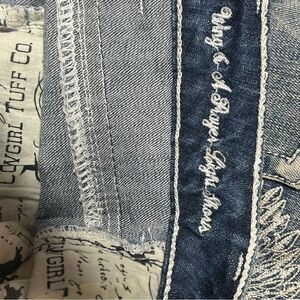 Cowgirl Tuff “ A Wing And A Prayer “ distressed Denim Embossed Shorts Sz 29