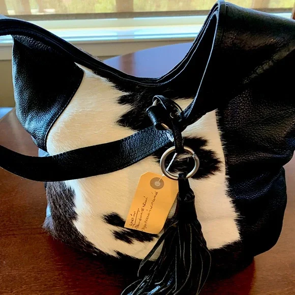 It is a beautiful black pebbled leather on the sides, bottom and strap. The body is brown and white. It is a dyed stencilled cowhide.The name is New York