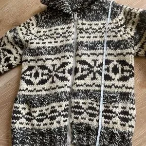Wool Cowichan sweater, handmade (I’m guessing). No brand or size tags.