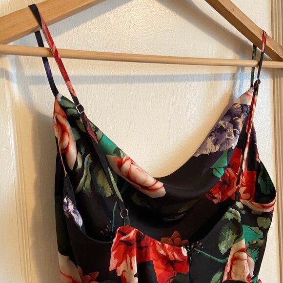 Glamorous silky floral dress! The slightly fitted drapey cut with a gathered waist. The adjustable straps ensure a tailored fit and the high lateral slit allows freedom of movement. Great for summer weddings!