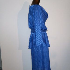Cowl neck, slight bat-wings / dolby sleeves, and peplum waist with original belt. Elastic waist with belt loops. Dress is unlined but not transparent. Very comfortable to wear. Excellent condition. No damage. Has been stored in cedar trunk.
