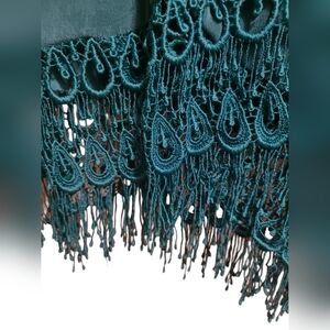 NWT Marallis turquoise long-sleeved tunic with beautiful fringe. It has a little shimmer, a cowl-neck, an asymmetrical hem, and all the fringe! 95% Acetate 5% Lycra Spandex. Looks like new old stock based on the tag.