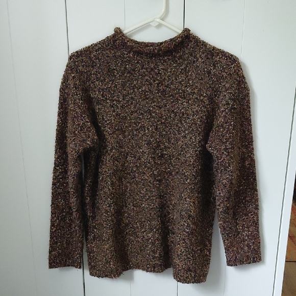 This brown turtleneck sweater boasts a cozy textured knit, making it perfect for cooler weather. The rich brown tones with subtle variations add a touch of sophistication to your wardrobe. Ideal for staying warm and stylish.