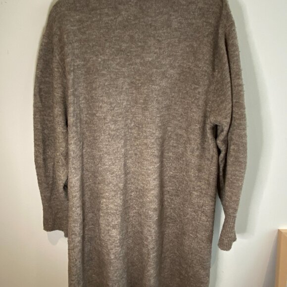 Cozy, ligh brown duster cardigan from H&M. Size small, oversized fit, 24" pit to pit with room to stretch further. Could easily fit a medium. 41% acrylic, 4% wool, 3% elastane, 52% polyester.