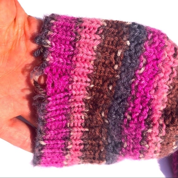 Hand knitted socks, gently used. Blue, pink, and brown tones. These are ankle high, will slouch down. Measures 12 inches high.