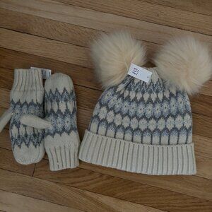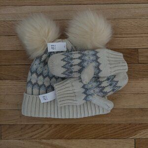 Stay warm with this stylish knit hat and mittens set. Features fluffy pom poms and a classic pattern. Never used, only hat has tag. Size M/L, 3-4 Years old.