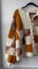 Amazing cozy patchwork knit cardigan! My guess is hand knit. Love the blends of yarn and warm tones. Great buttons too. The last pic is a screen shot of me in the sweater. I’m 6’1 and typically an XL. I think this cardigan could really work at any style. A special piece!