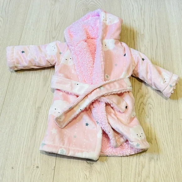 Soft and fluffy pink robe for baby. Perfect for warmth and comfort.
