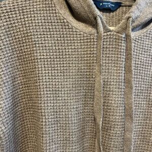 Warm and stylish tan hooded sweater. Perfect for casual wear.