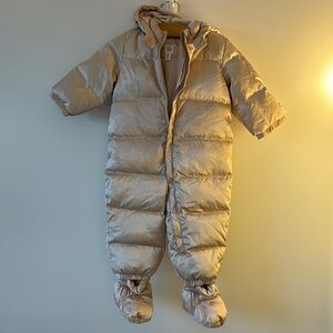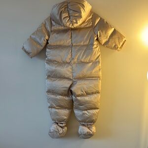Warm and stylish tan puffer snowsuit. Features a hood and attached booties. Perfect for cold weather.
