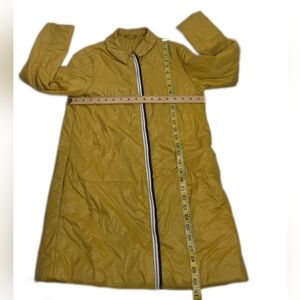 Lightweight cozy zip up jacket. yellow with centre vertical stripe trim and side pockets. Good for chilly but not snowy weather. Very lightweight and good for travel. small