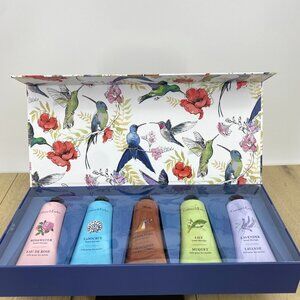 New In Beautiful Bird & floral Box Crabtree & Evelyn Hand Therapy Collection Box Set. Ultra moisturizing formula enriched with Shea butter, macadamia nut oil & myrrh extract to deeply hydrate & condition hands. Collections contains 5/ 100 G /3.5oz each. Rose Water, La Source, Gardeners, Lily & lavender.