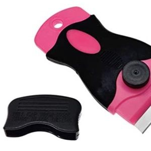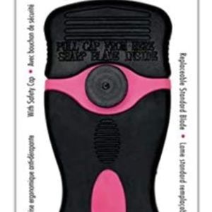The razor / scraper includes a safety cap comparatively to other tool without it. Standard sized blade is replaceable. Comes with extra safety features and a non-slip ergonomic handle!