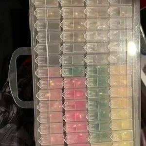 This storage case is packed with colourful beads and sparkling rhinestones, perfect for all your crafting projects! It has multiple compartments to keep your supplies neatly organized and easily accessible.