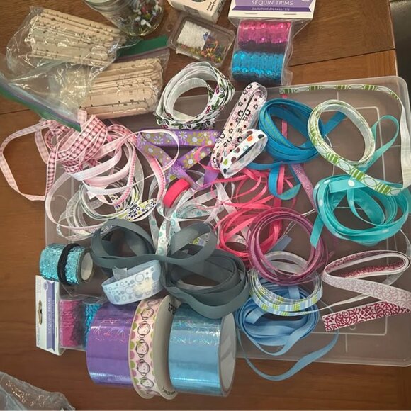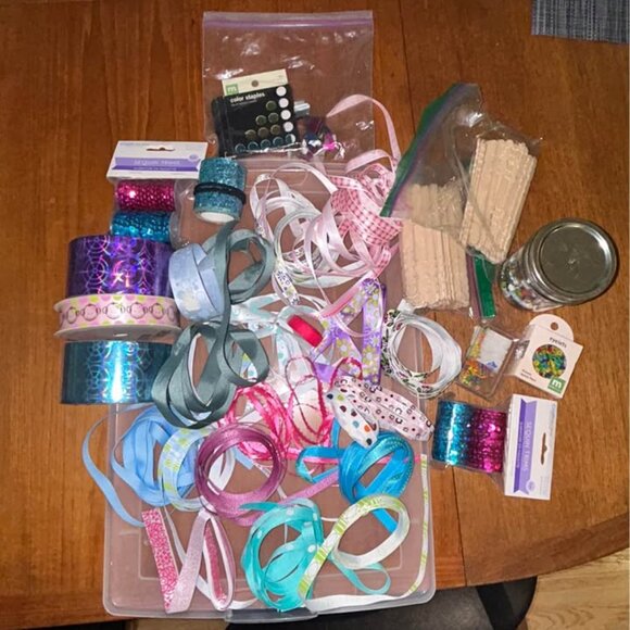 23 lengths of ribbon most about a metre. 2 sparkly duct tape rolls