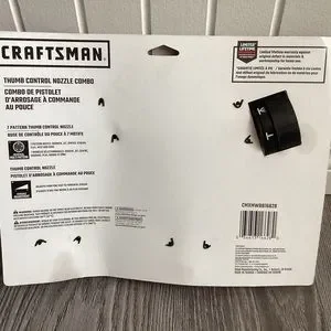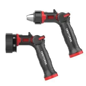 The Craftsman(R) 2-pack heavy duty thumb control nozzles effectively tackles any outdoor watering task with spray options including 7 pattern nozzle - shower, soaker and everything in between, and 3-way adjustable nozzle. Made of helmet-grade plastic for long term use, this combo is designed for hot and cold applications, gives users full control over the water pressure needed for each job and features a convenient on/off lever. Zinc alloy inner core resists leakage, while ultra-durable ABS nozzle has been built with a soft TPR comfort grip to help relieve hand stress. Backed by a limited warranty, Craftsman(R) spray nozzles are guaranteed to perform throughout the most challenging watering tasks, for years to come.