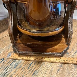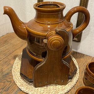 Ensemble rare de la Céramique de Beauce, comprenant la grande théière inclinable modèle 3462 avec support en bois foncé (sans couvercle), et trois tasses assorties modèle 3463. Ce service fait partie de la série Colonial, produite au Canada en 1977-1978 en très petite série.
