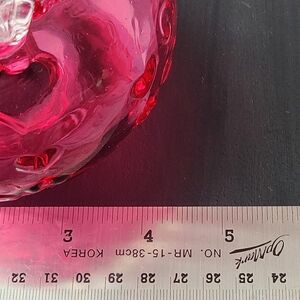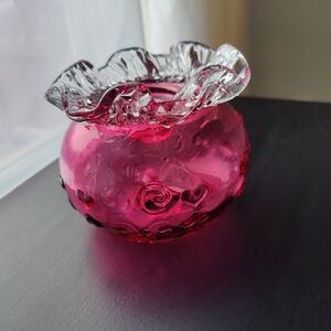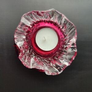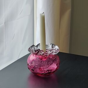 Elegant pink glass candle holder with a ruffled edge. Perfect for adding a touch of cranberry color to any room.