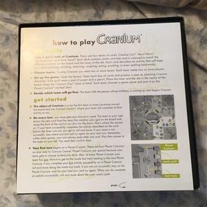 Contents of the box include 1 playing board, 1 hourglass, 1 - 10 sided die, 4 game pieces (red, yellow, green and blue), 4 pencils, 4 notepads of various thicknesses, 1 cranium clay pot (no clay), 200 "Word Worm" yellow cards, 197 "Star Performer" green cards, 199 "Creative Cat" blue cards and 196 "Data Head" red cards. (Some of the red cards have white markings on these where they came into contact with the clay - this does not affect the playing of the game.)