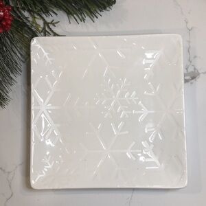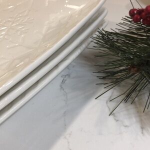 Crate and Barrel Snowflake Embossed White Appetizer Dessert Salad Square Plates (4) glazed stoneware