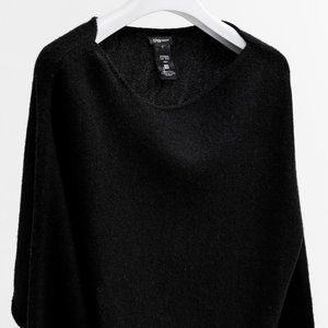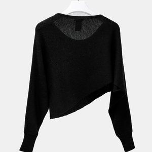 A black wool cropped sweater featuring an asymmetrical off-the shoulder neckline, asymmetrical handkerchief hem, and ribbed cuffs.