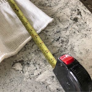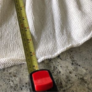 Linen/nylon blend. Asymmetrical hem. Bright white. There is not a size tag but my mannequin is a size 6. I would say it is a size 4 or 6. But please check measurements and remember there is stretch. Lovely to wear in summer with jeans, skirt or shorts.