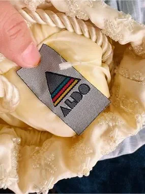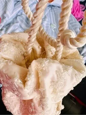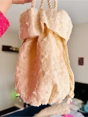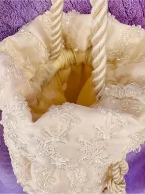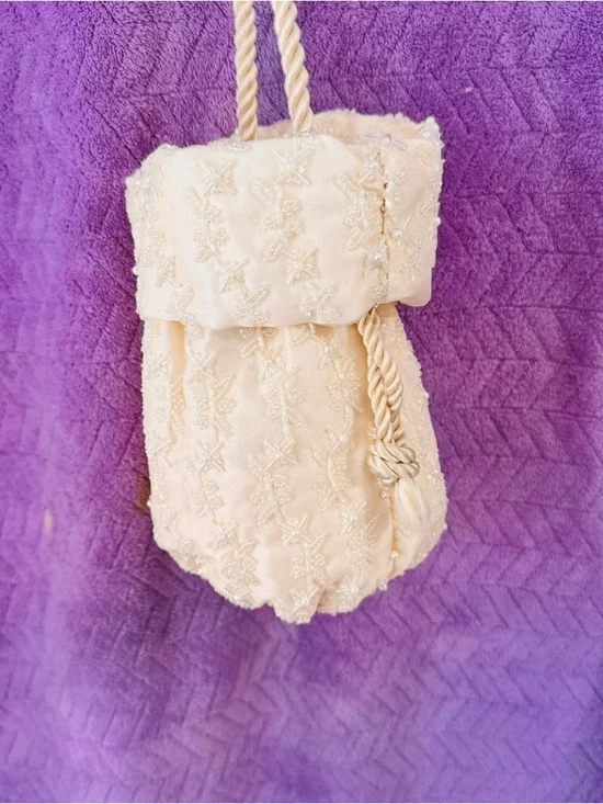 Chic cream mini drawstring bag with delicate bead and star-pattern embroidery. Soft fabric and twisted rope straps for easy carrying. Elegant cream tone complements formal and casual looks. Subtle beaded detailing adds a refined, feminine touch.