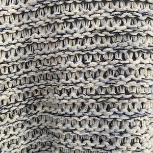 This sweater is lightweight and the knit is a looser knit. You will want to wear a cami or tank underneath. The back is a sheer material, pleated and with some floral cut outs. The over all fit seems to be generous in the body. On the back side of one of the sleeves it has a slight stain that I almost missed. Over all good shape and would look cute with Jeans. Cream is a European Brand. No tag on the inside for material listing. See measurements in pictures.