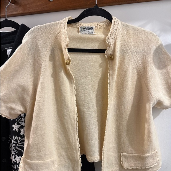 Elegant cream cardigan with button-front design, perfect for layering. Features intricate detailing for a sophisticated look.