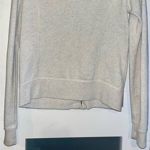 Stylish cream button-up sweater with a distinctive logo. Features a cozy collar and front pockets.