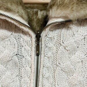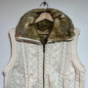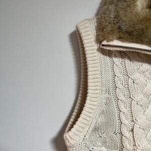 Cream Cable Knit Sweater Vest with Faux Fur Collar - Zip Front - Petite Fit (12” PTP)