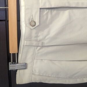 These cream chinos feature a high-waisted design with a clean, straight leg silhouette, offering a polished and professional look. The structured fabric and pressed creases add to their refined appearance, making them ideal for formal occasions.