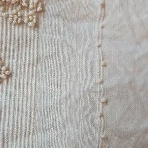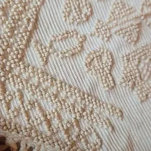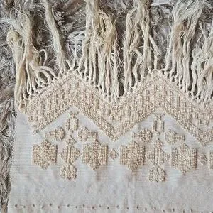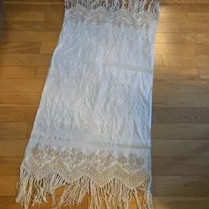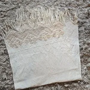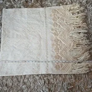Elegant cream throw rug with intricate embroidery and fringe detailing. Perfect for adding a touch of sophistication to any room.