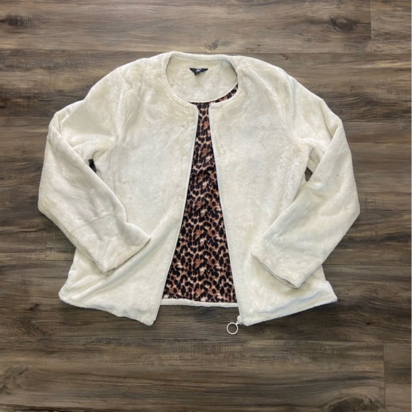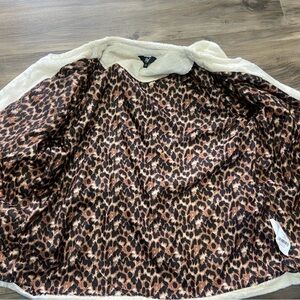 Stylish cream jacket. Features leopard print lining. Perfect for layering.