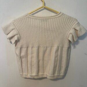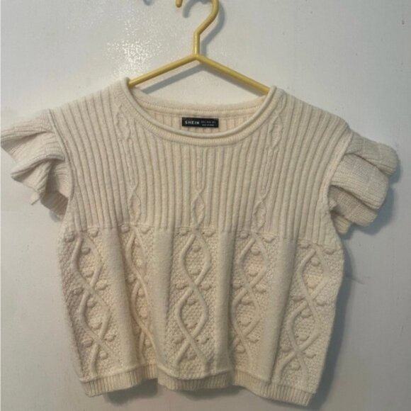 Stylish cream knit top with ruffle sleeves. Features a textured pattern for added elegance.