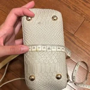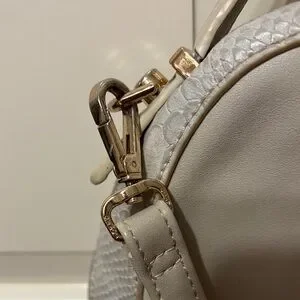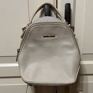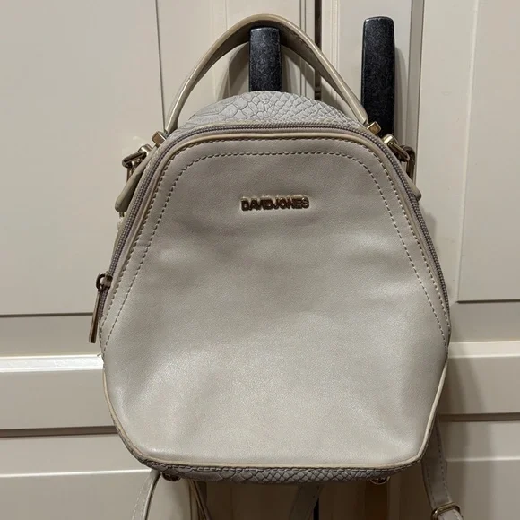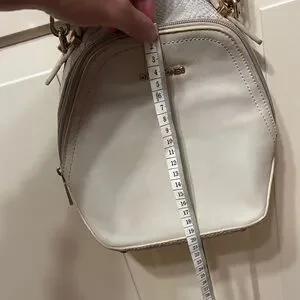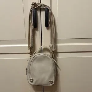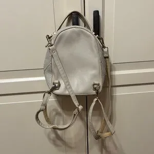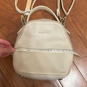 cream mini backpack with gold-tone hardware. Smooth cream exterior with subtle textured accents. Compact and versatile for hands-free wear. Clean, modern style that pairs with everyday looks.