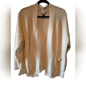 Stay cozy and stylish with this cream open-front sweater. Slits on the side. Perfect for layering and adding a touch of elegance to any outfit. 100% cotton! worn but in good condition!