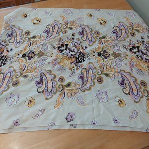 This previously owned scarf is in good used conditions and features a paisley and floral pattern throughout with fringes on each end. Please note there is a slight flaw in fabric as shown in last photo.(Not noticeable when wearing)