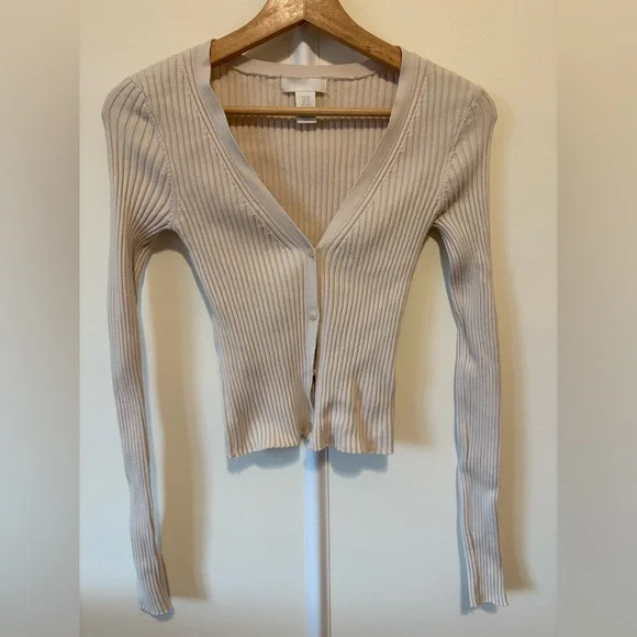 Stylish cream ribbed cardigan with long sleeves and button closure.