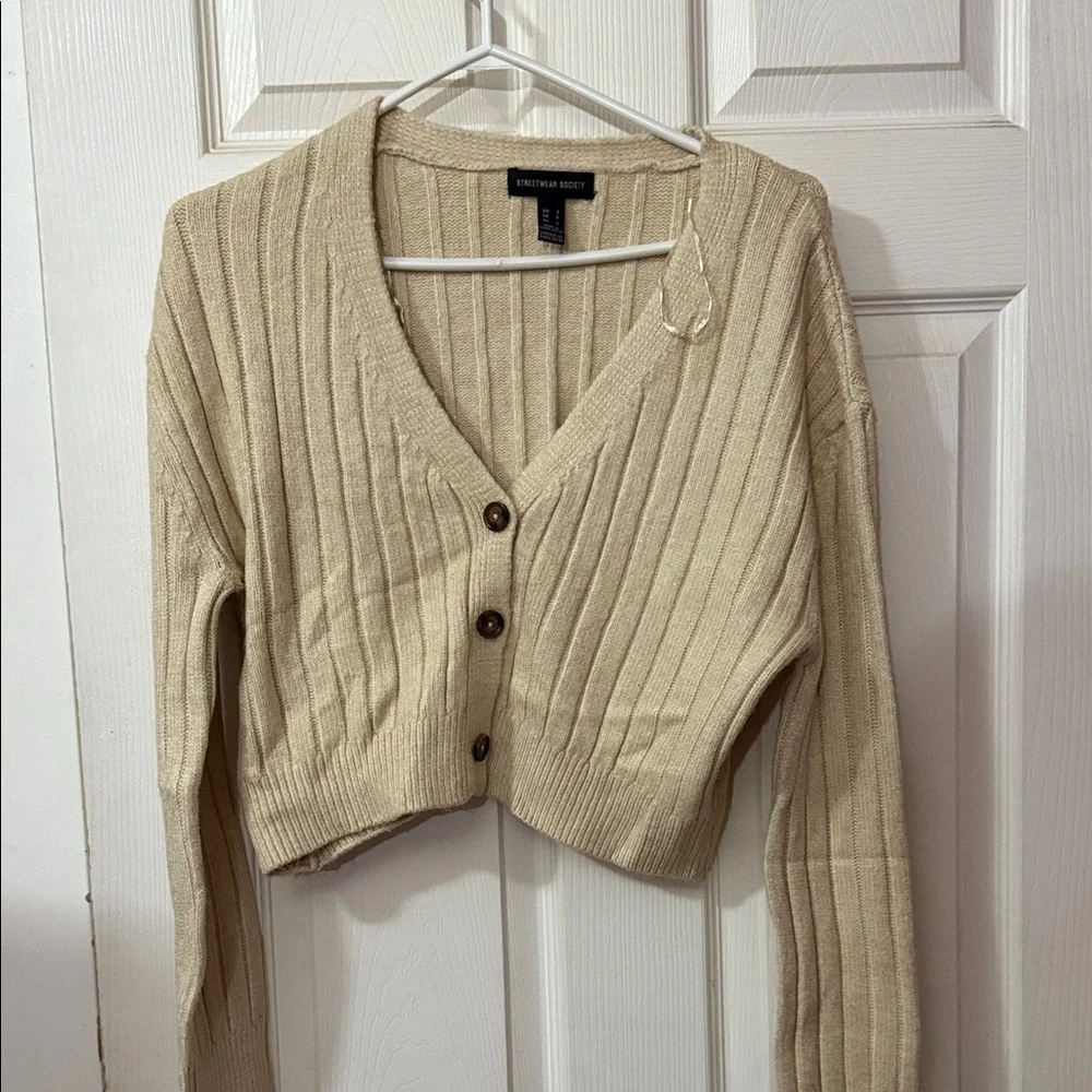 Chic ribbed cardigan with button-up front. Ideal for layering.