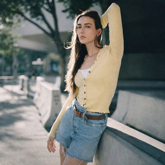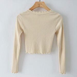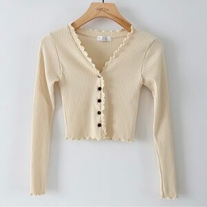Cream Ribbed Cropped Cardigan Button Front Ruffle Trim Lightweight Knit Top